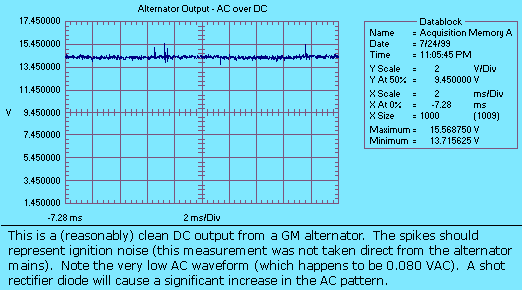 This document isn't complete - I'll be adding to it as I get the time to do it right. In the meantime, you can see a comparison of the output of a properly operating alternator and a defective one, as well as some simple DVM tests to check whether you're suffering from a failed rectifier.